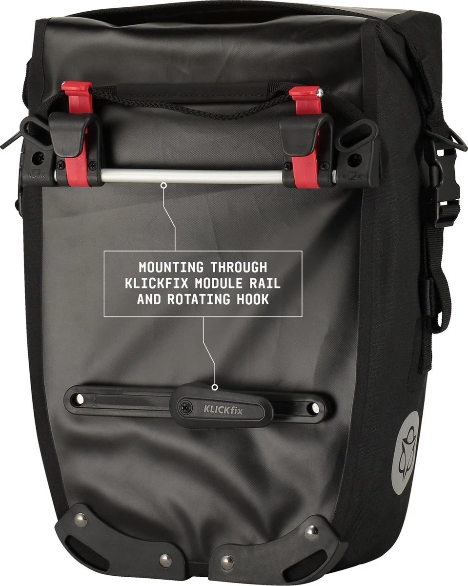 De Shelter Clean waterproof fietstas kan zowel op een voor- als achter drager gemonteerd worden door middel van de KLICKfix Module Rail en verstelbare haak. Dit vormt een solide bevestiging aan de fiets die rammelen of slingeren tegengaat. Aan de binnenzijde heeft de tas twee compartimenten zodat bagage goed georganiseerd meegenomen kan worden.
