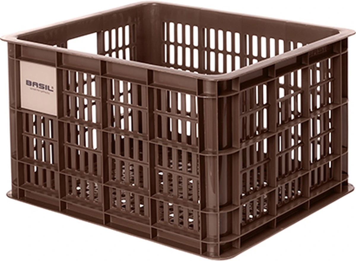 De Basil fietskrat in de maat M is een bruine fietskrat voor op een dames- of herenfiets. De fietskrat is gemaakt van duurzaam materiaal en heeft een inhoud van 29,5 liter.