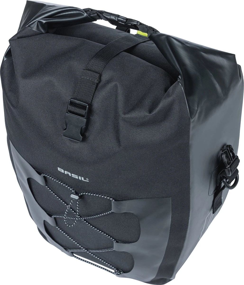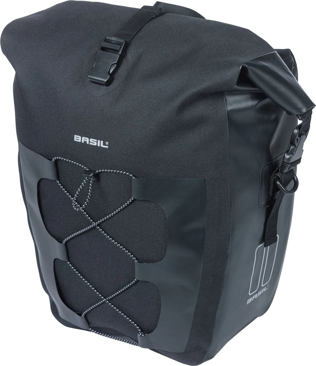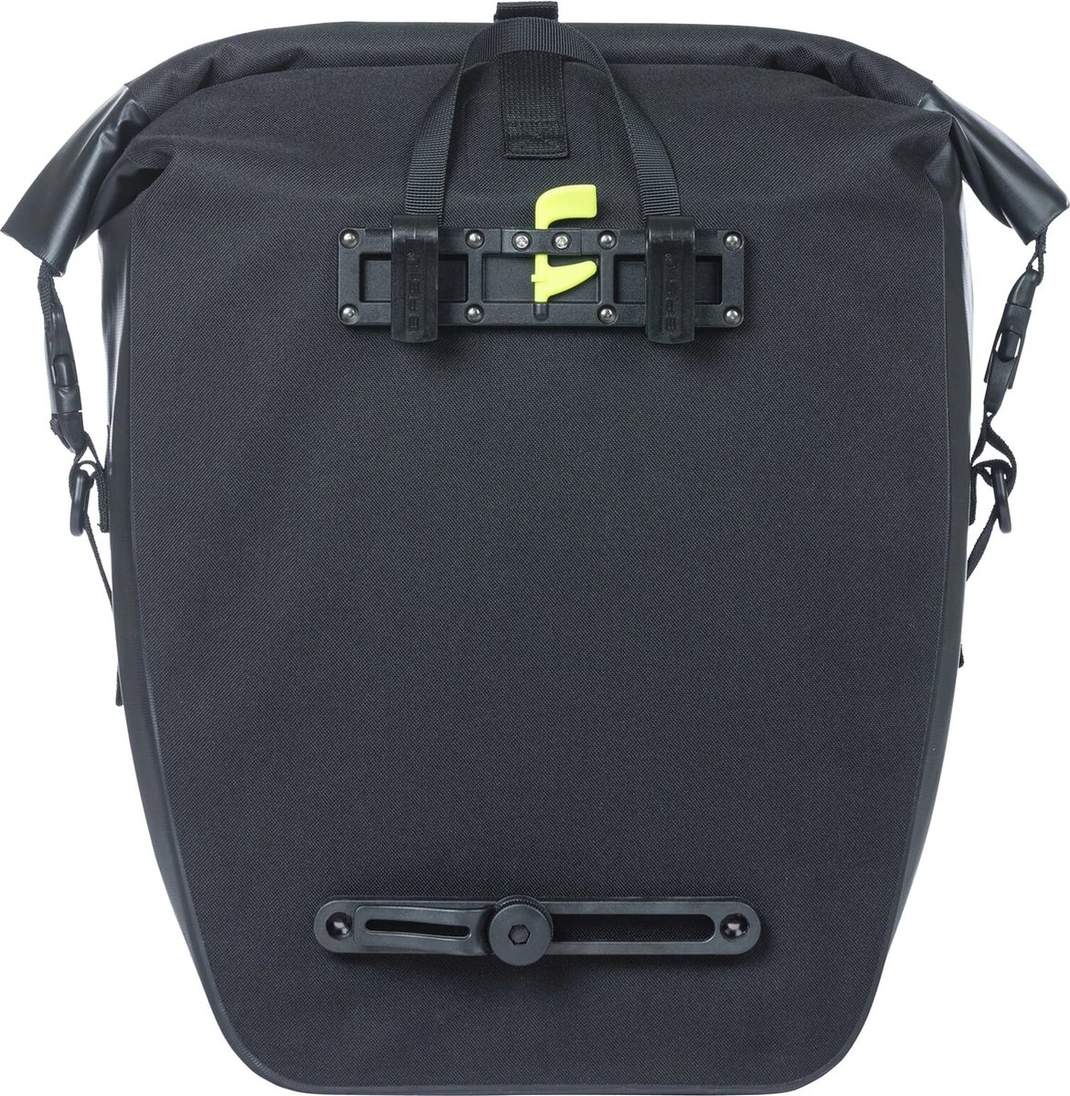 De tas sluit je met een roltopsluiting af. Deze sluiting kun je op twee manieren rollen: naar de achterzijde van de tas of bovenop de tas. De kliksluitingen kun je namelijk flexibel inzetten. Net wat je zelf fijner vindt! Je bevestigt de fietstas met het Basil Hook On systeem aan de fiets. Je kunt de tas extra bevestigen aan de frame van de fiets dankzij het extra instelbare haakje aan de onderzijde van de tas.