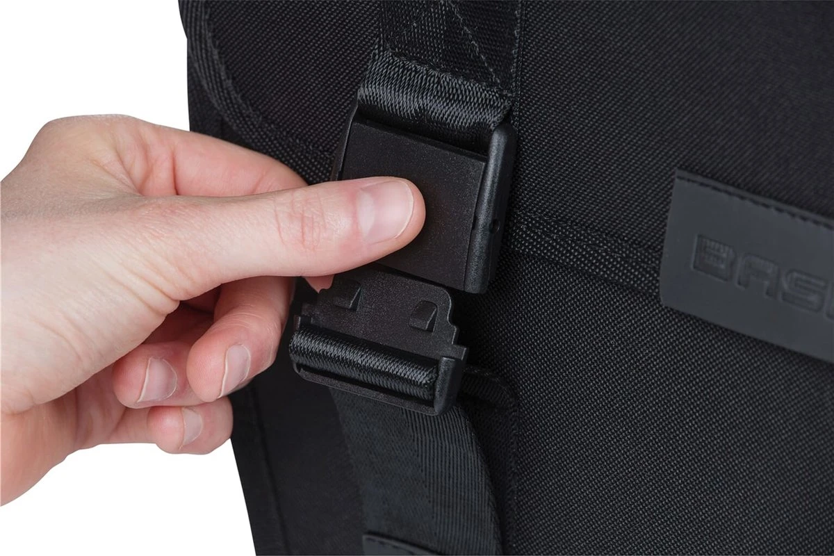 Kenmerkend aan de tas is de afronding aan de voorzijde. Zo voorkom je dat je tijdens het fietsen met je hak tegen de tas komt. De tas heeft kliksluitingen die makkelijk te openen zijn. Je hoeft op deze manier geen kracht te zetten om de tas te openen.