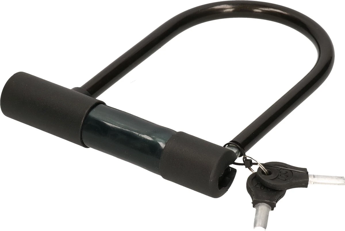 Fietsslot/beugelslot zwart 16 x 20 cm, universeel te gebruiken voor fietsen, motoren en dergelijke. Het hangslot heeft een beklede beugel tegen lakschade en een rubberen oppervlakte op de vergrendeling. Inclusief 2 sleutels. Weerbestendig. Afmetingen: ongeveer 16 x 20 cm. Materiaal: gehard staal. Kleur: zwart. U-sloten – beugelsloten – hangsloten – fiets accessoires