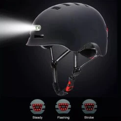 Fietshelm- Met Voor- En Achterlicht-Skatehelm -Maat-M-54 Tot 57 Cm-Helm Mat-Zwart – LED Verlichting