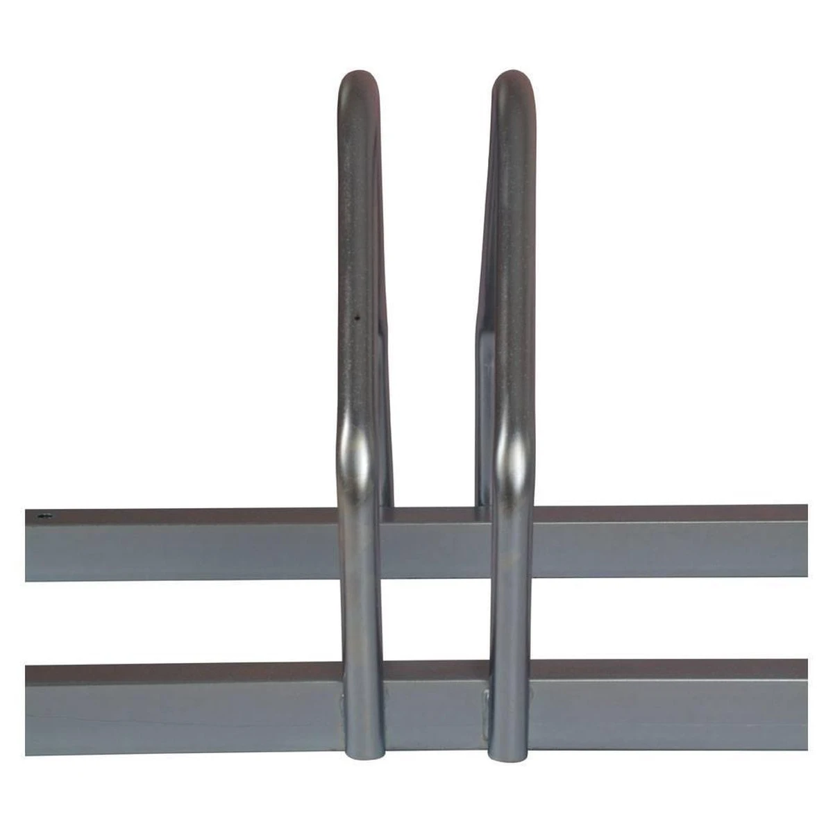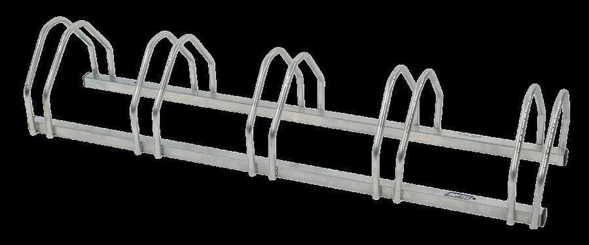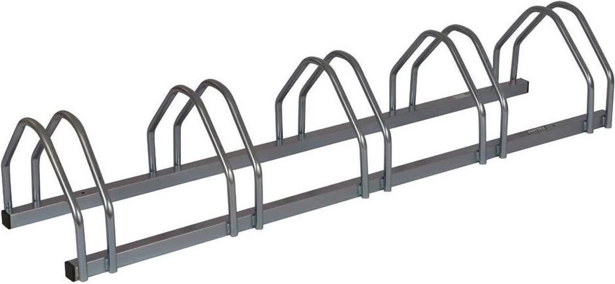Dit fietsenrek van Mottez biedt plaats aan vijf fietsen. De fietsen kunnen gemakkelijk naast elkaar of tegenover elkaar worden geplaats in de zinken fietsenstandaard. Dit rek is stevig en compact, en doordat de fietsen netjes opgeborgen zijn bespaart u kostbare ruimte.