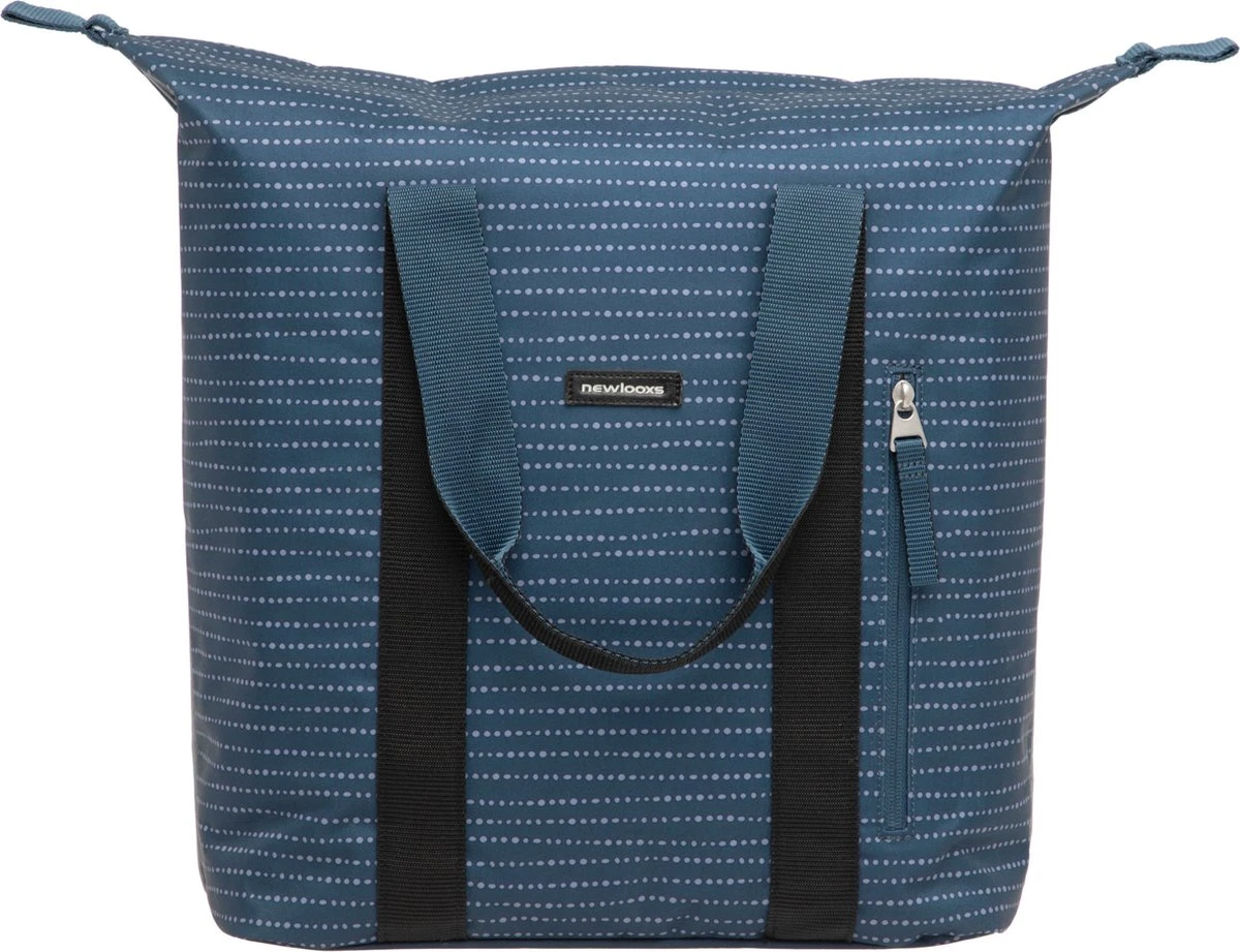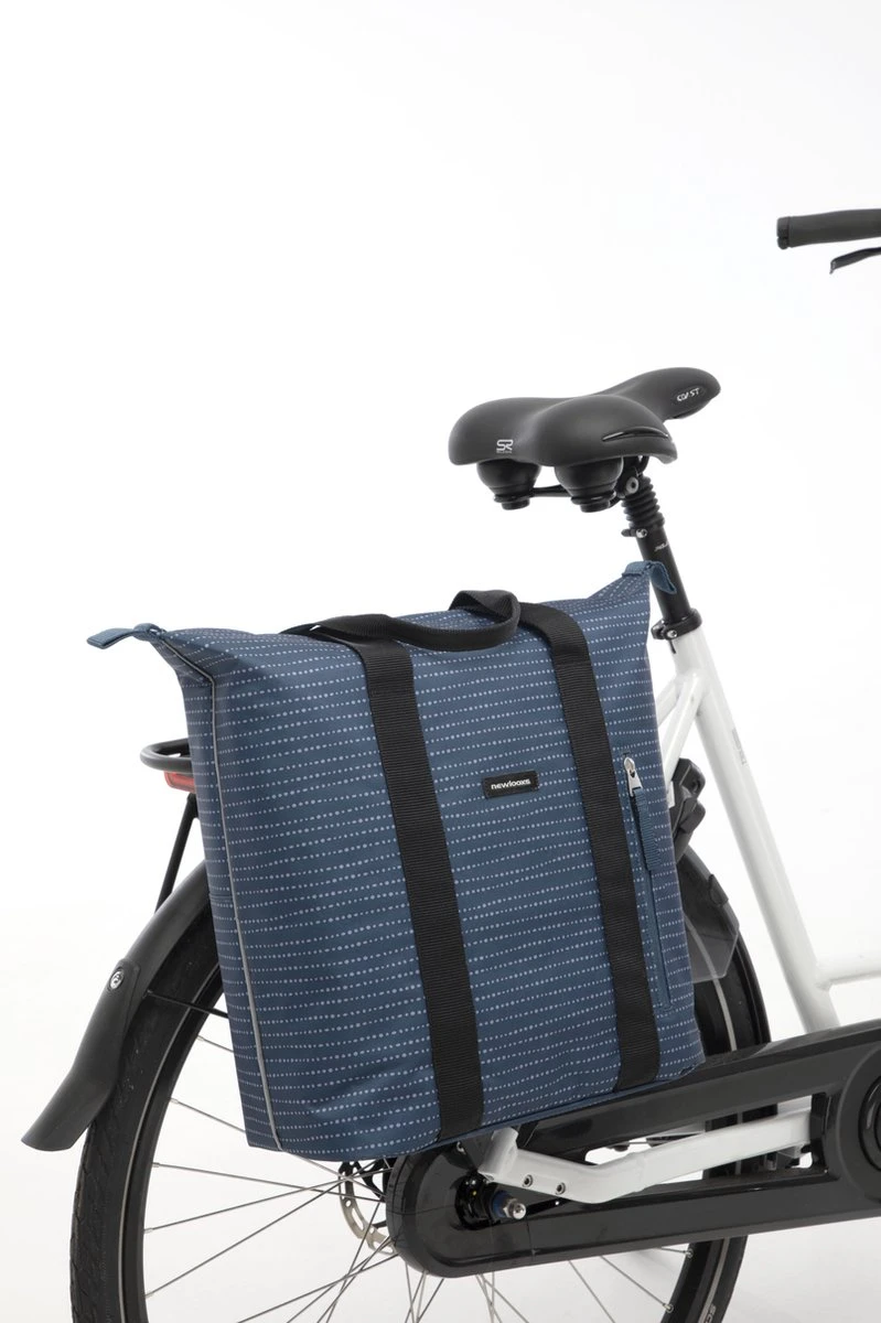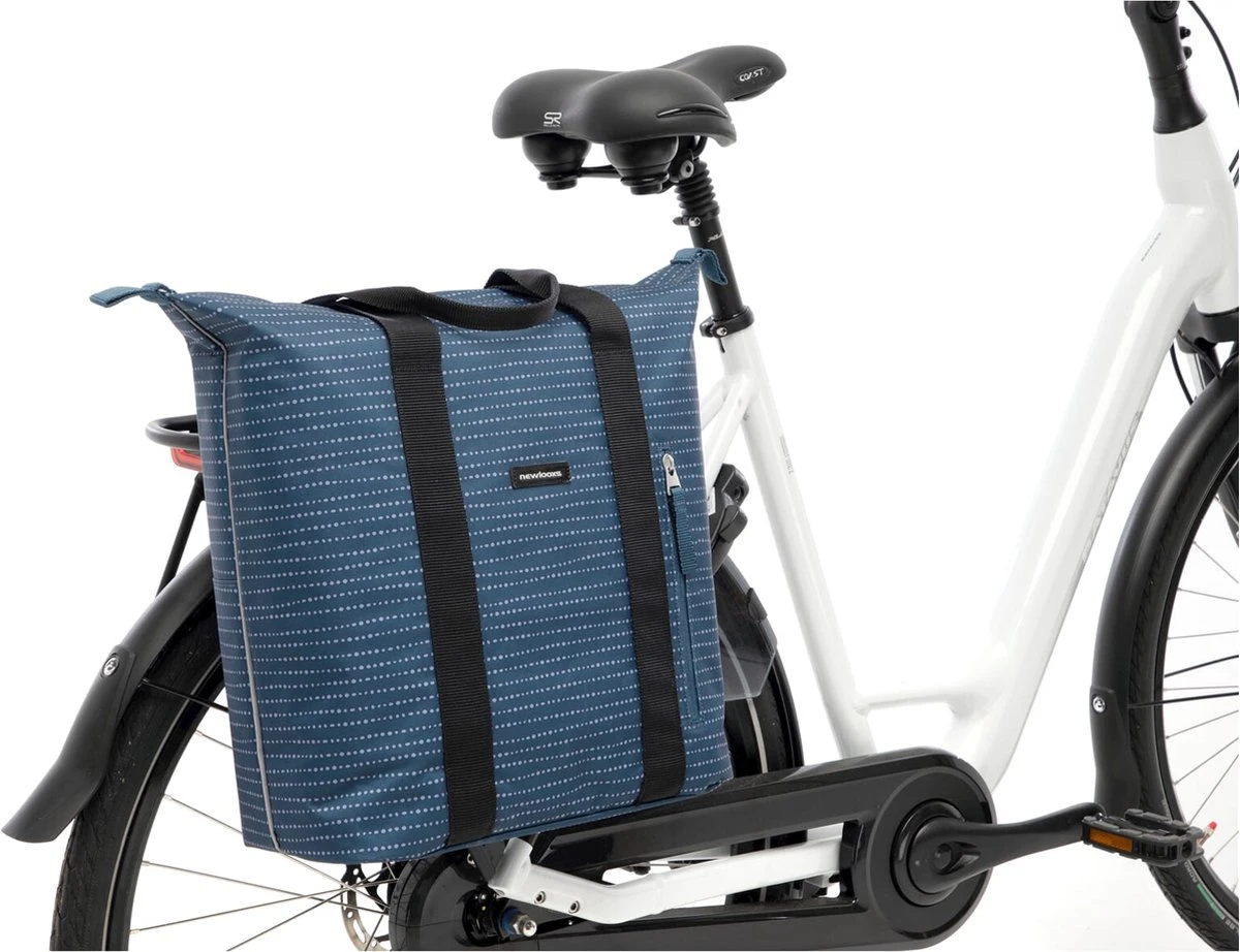De fietstas wordt aan de bagagedrager bevestigd met New Looxs kunststof haken. Dat maakt deze tas geschikt voor vrijwel alle fietsen, ook elektrische. Je kunt de tas extra vastzetten met het klittenbandje tussen de haken. Als je de tas van de fiets haalt, dek je de haken af met een ritsvakje. Hierdoor heb je geen last meer van de haken en ziet de tas er uit als een gewone shoppertas!