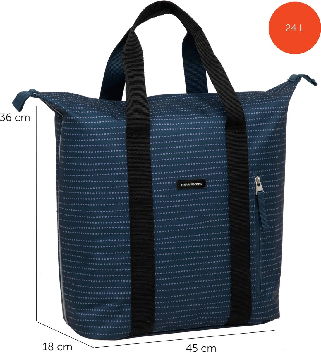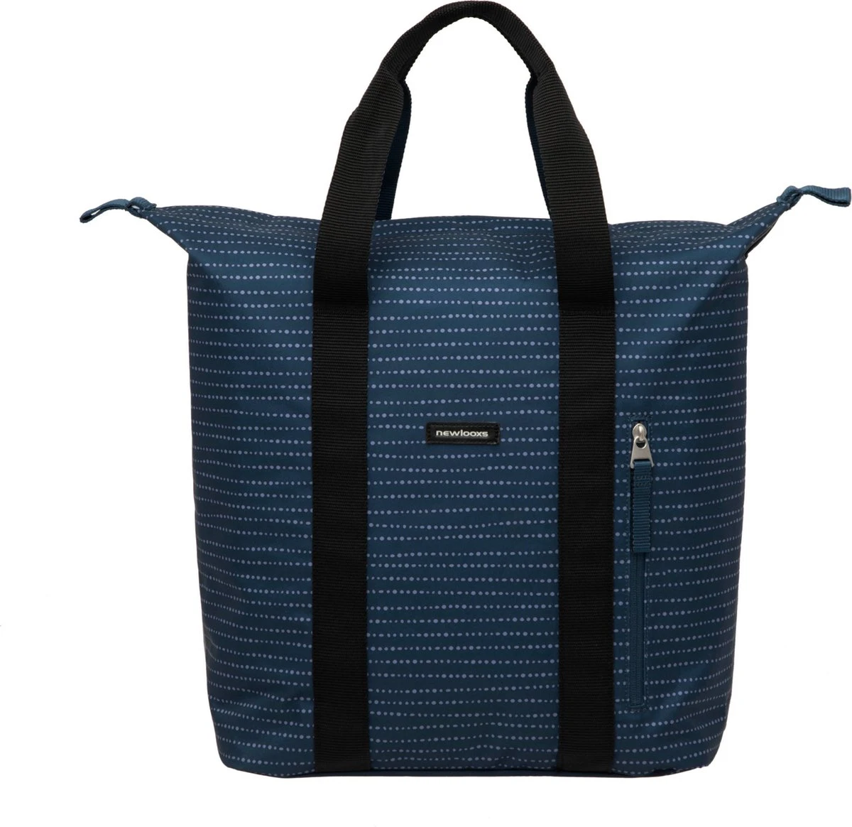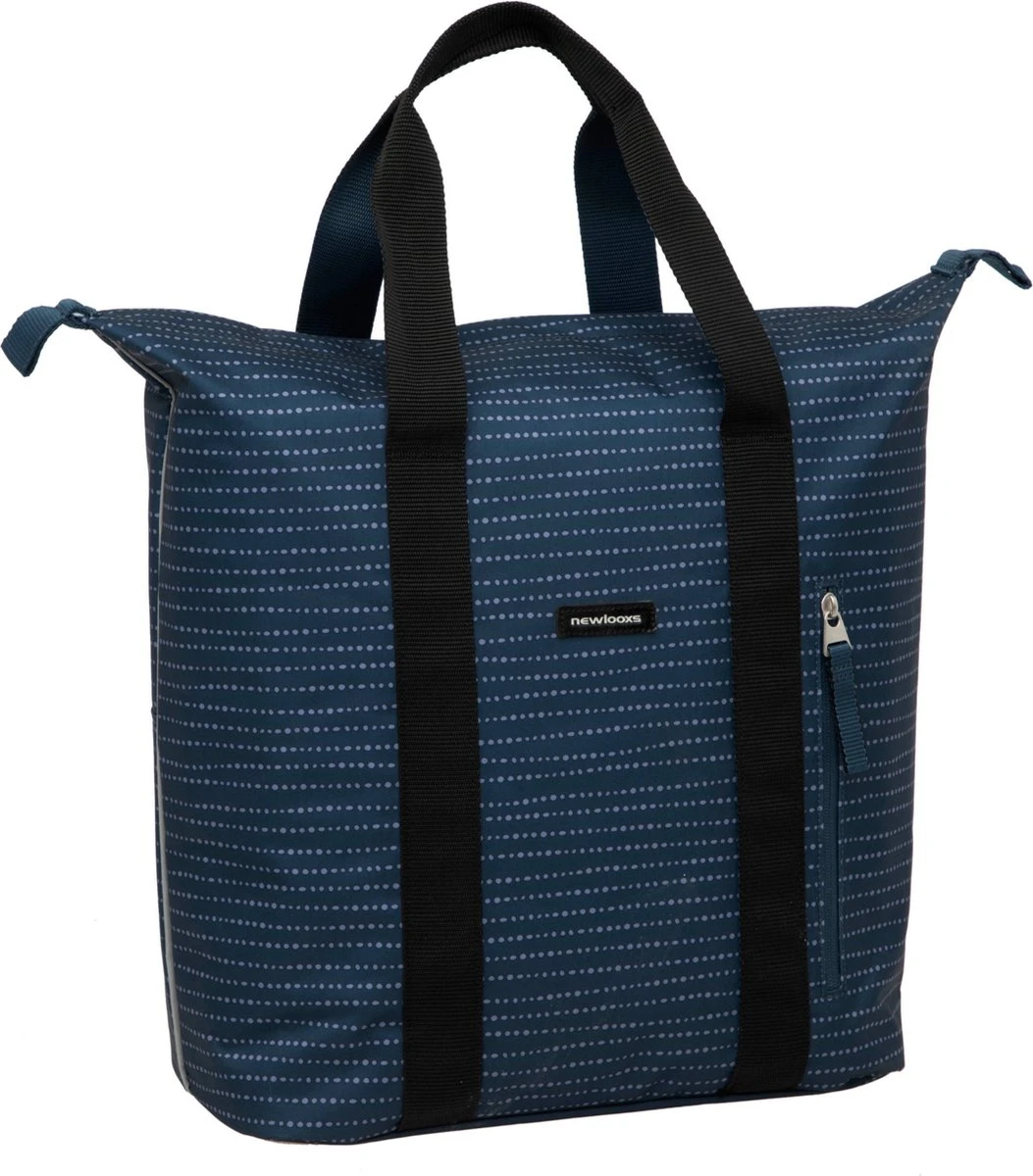 De fietstas wordt aan de bagagedrager bevestigd met New Looxs kunststof haken. Dat maakt deze tas geschikt voor vrijwel alle fietsen, ook elektrische. Je kunt de tas extra vastzetten met het klittenbandje tussen de haken. Als je de tas van de fiets haalt, dek je de haken af met een ritsvakje. Hierdoor heb je geen last meer van de haken en ziet de tas er uit als een gewone shoppertas!