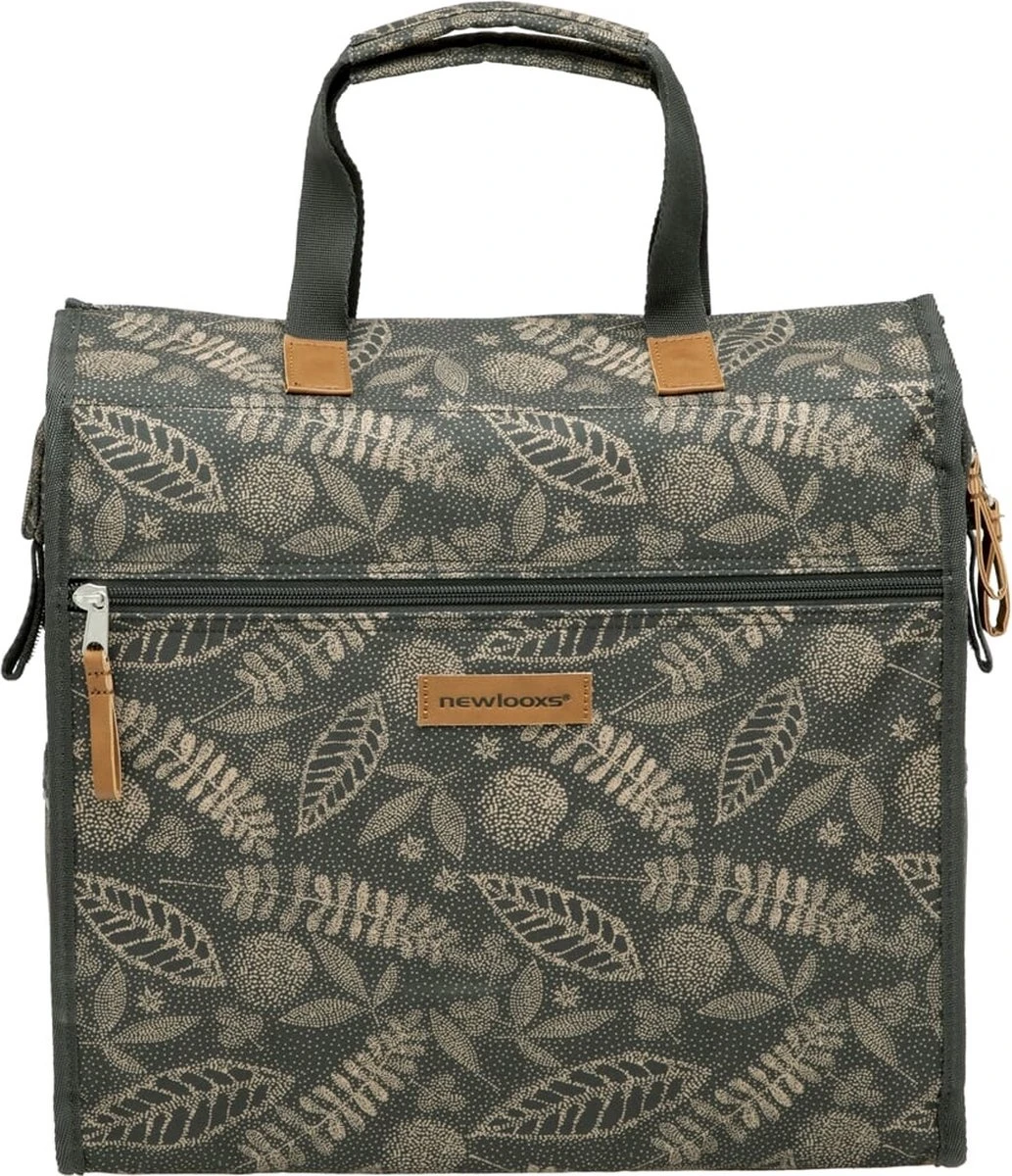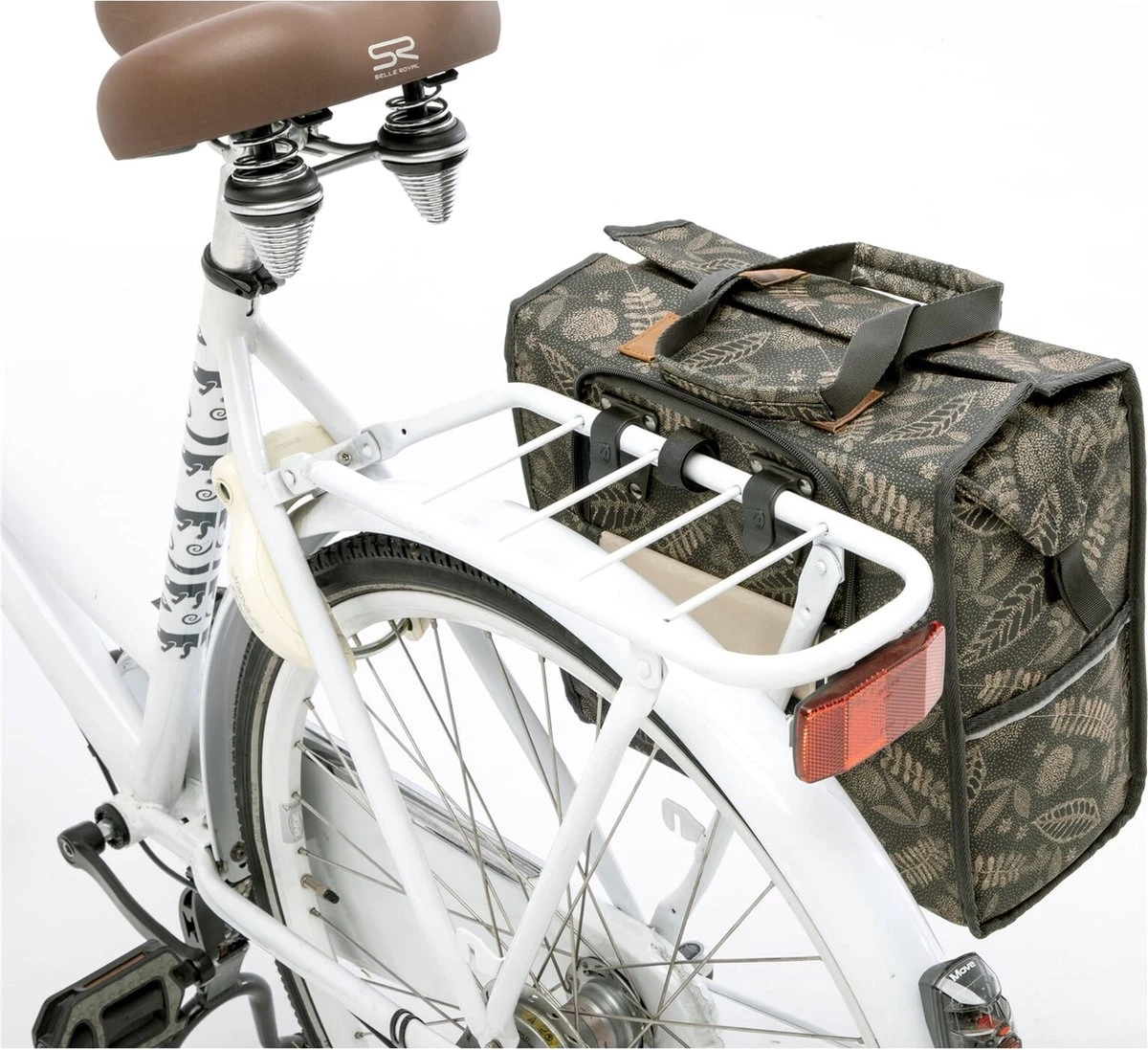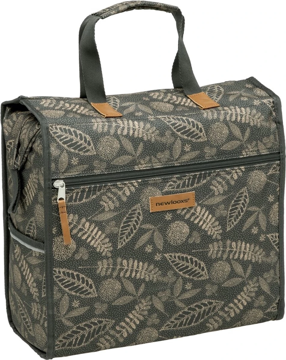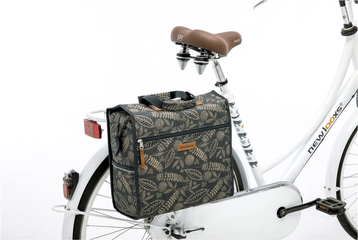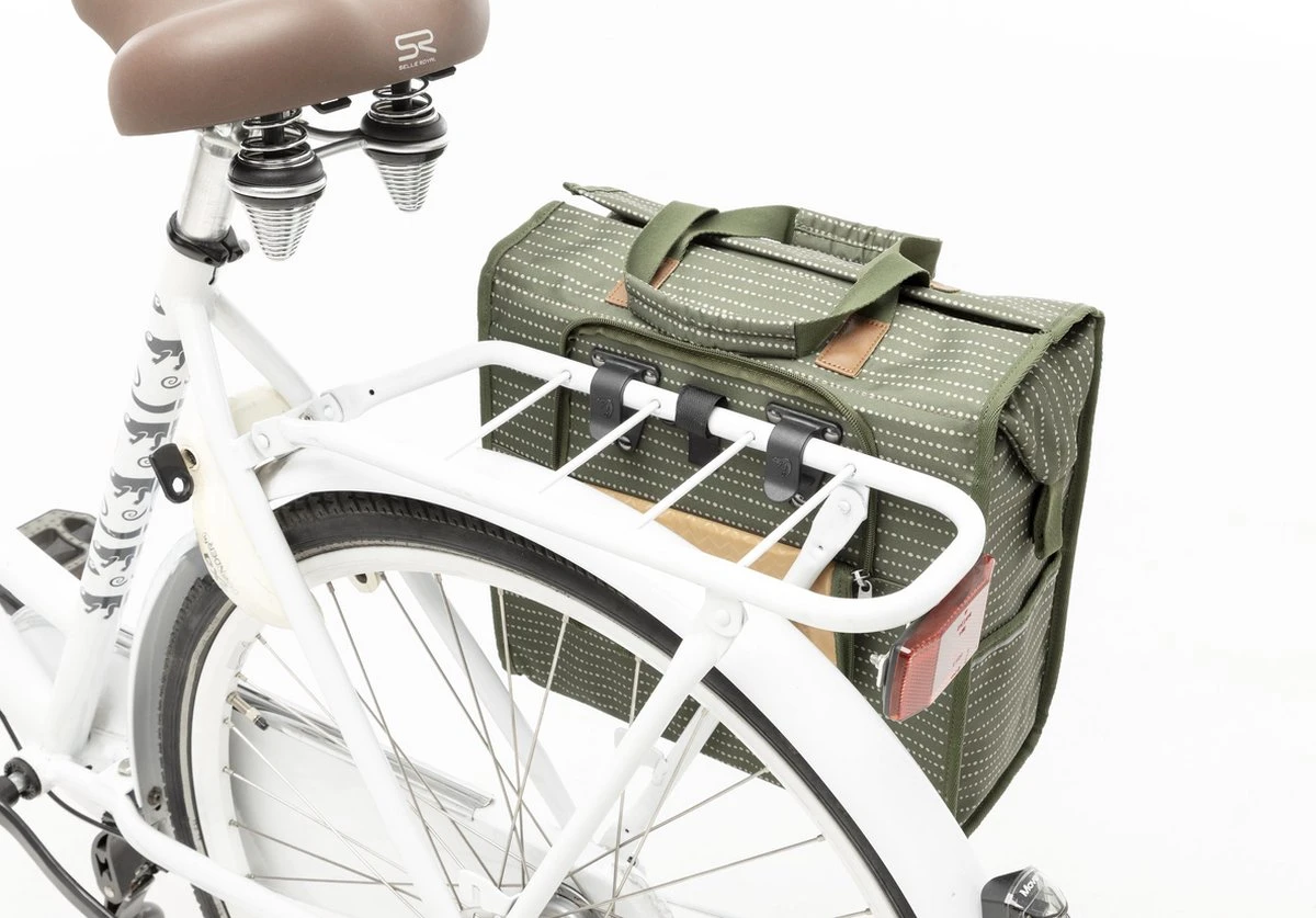 De fietstas wordt aan de bagagedrager bevestigd met New Looxs kunststof haken. Dat maakt deze tas geschikt voor vrijwel alle fietsen, ook elektrische. Je kunt de tas extra vastzetten met het klittenbandje tussen de haken. Als je de tas van de fiets haalt, dek je de haken af met een ritsvakje. Hierdoor heb je geen last meer van de haken en ziet de tas er uit als een gewone shoppertas!