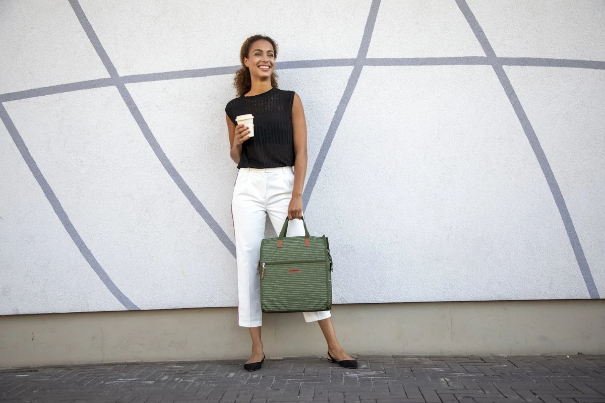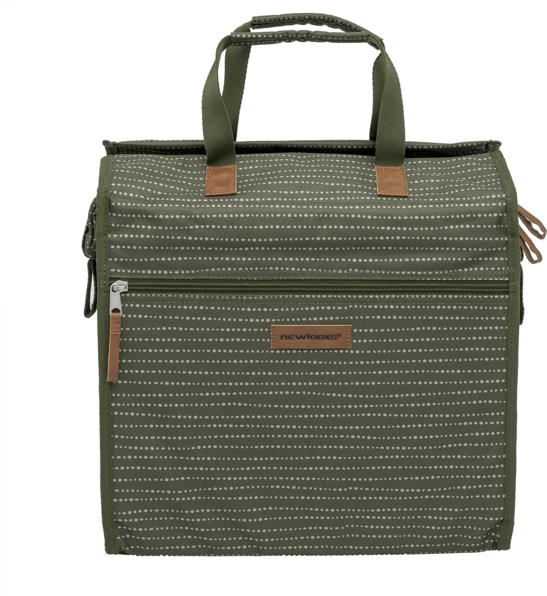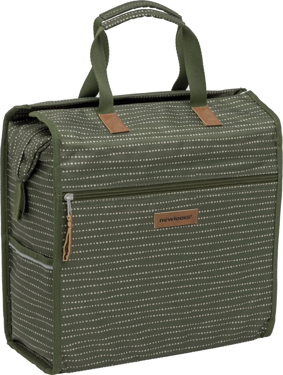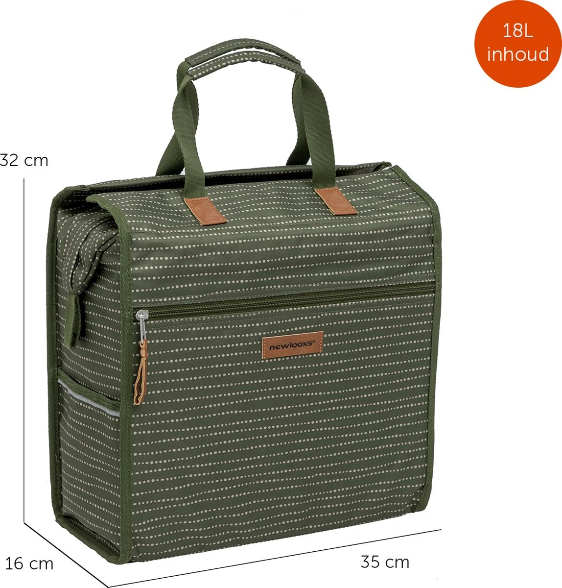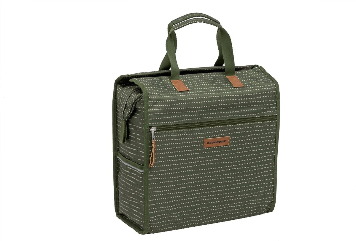 De fietstas wordt aan de bagagedrager bevestigd met New Looxs kunststof haken. Dat maakt deze tas geschikt voor vrijwel alle fietsen, ook elektrische. Je kunt de tas extra vastzetten met het klittenbandje tussen de haken. Als je de tas van de fiets haalt, dek je de haken af met een ritsvakje. Hierdoor heb je geen last meer van de haken en ziet de tas er uit als een gewone shoppertas!