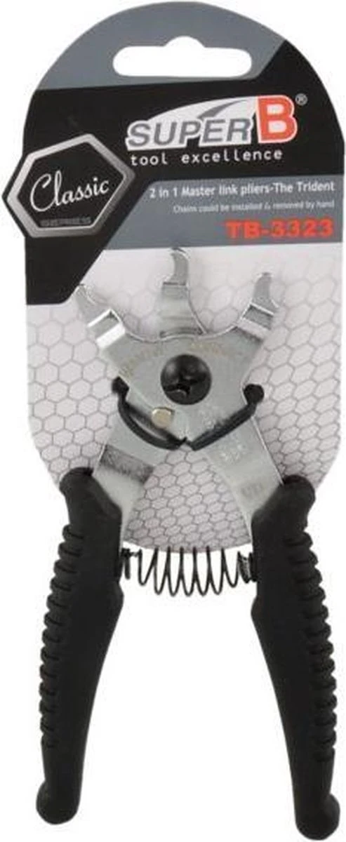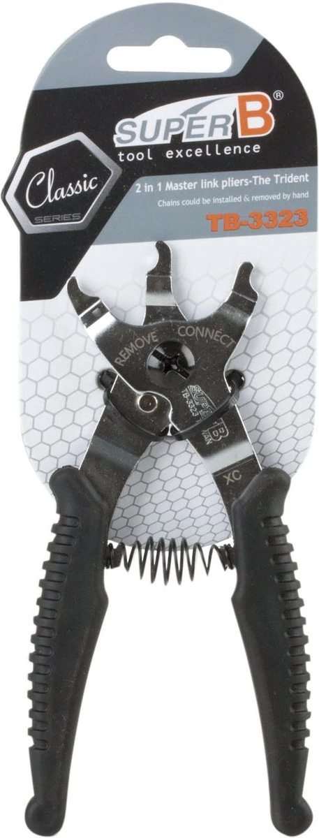 Met de SuperB award-winnende 2-in-1 missing link tang kan de missing link worden verwijderd en geplaatst met slechts 1 hand en 1 stuk gereedschap Het unieke ontwerp en speciale formaat kaken om verwijdering en plaatsen van missing link snel en gemakkelijk uit te voeren De tang is gemaakt van precisie hoogwaardig staal en voorzien van ergo grips voor meer comfort De tang is geschikt voor zowel KMC als SRAM kettingen Het verwijderen van missing links is niet bij alle merken hetzelfde Raadpleeg hiervoor de informatie van de producent- Kleur: ZWART- Merk: SUPERB