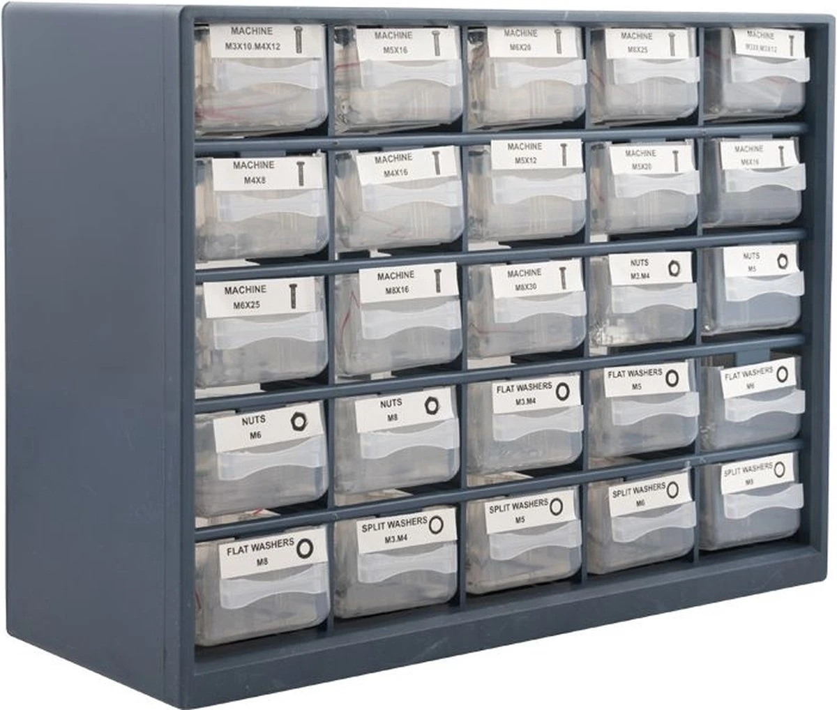 Opbergkast met 25 lades gevuld met bouten, moeren en ringen.