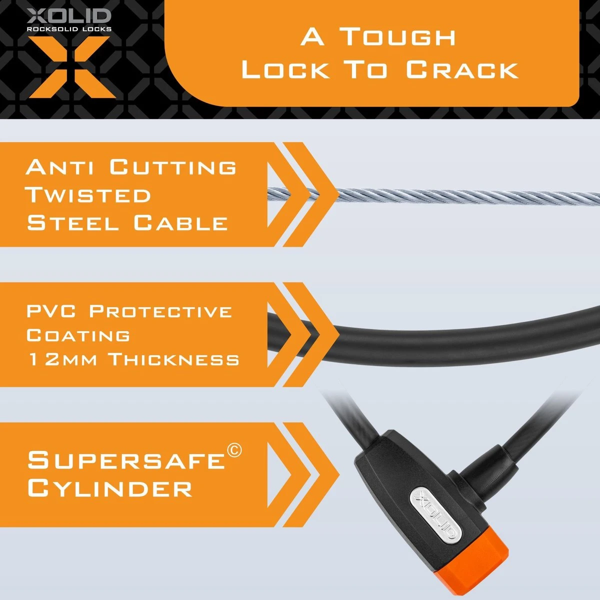 Sluit uw Fiets af met een Gerust hart. Want dit slot is Beveiligd met een Extra Stootvaste Kunststof Laag, een Staal Kabel Gehard en Gedraaid, en Supersafe® Cilinder.